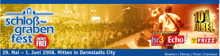 News | Bands | Lageplan | Anfahrt | Info | Galerie | Bewerben | Kontakt | Impressum | Presse | Sitemap© 1999-2008 Stage Groove Festival GmbH, Darmstadt | Alle Rechte vorbehalten | Webseite: VONTA